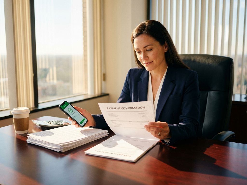 Zakenvrouw in marineblauw pak bekijkt betalingsdocument met smartphone bankapp op kantoorbureau met facturen