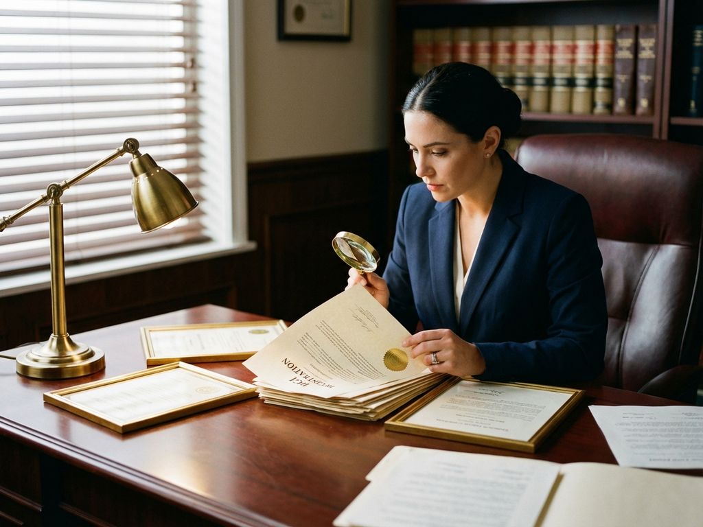 Zakenvrouw in marineblauw pak bestudeert BGI-registratiedocumenten met vergrootglas aan mahonie bureau